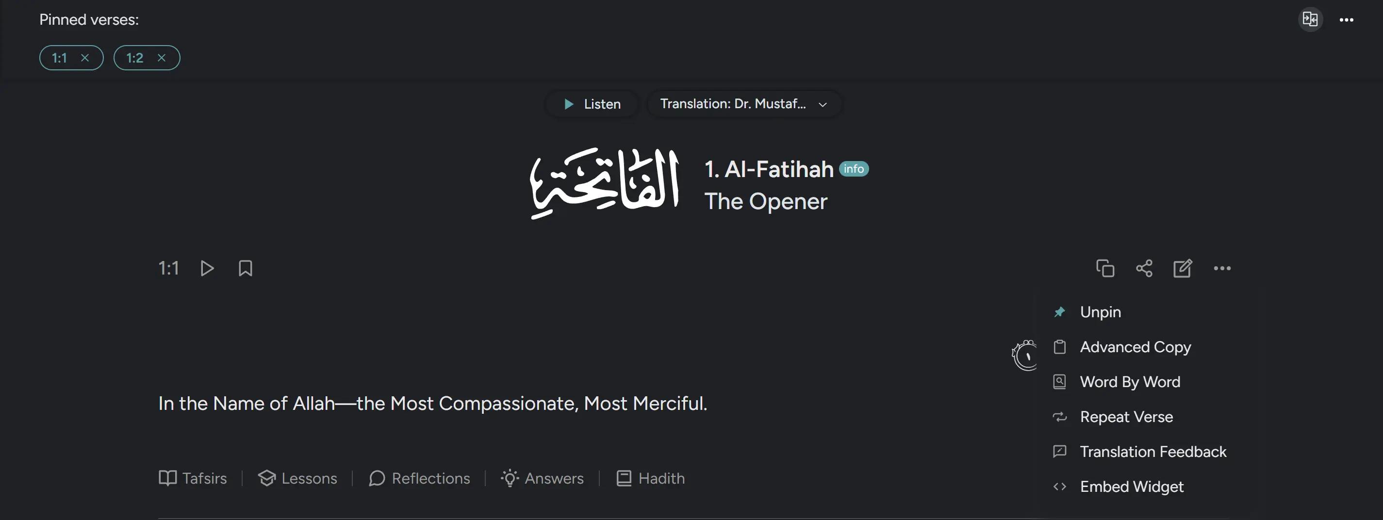 To try it, open the three-dot menu on any ayah and select Pin, or use the pin icon inside Study Mode.